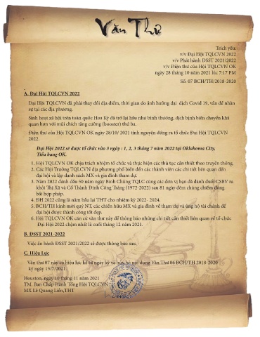 Điện thư của Hội TQLCVN OK ngày 28/10/ 2021 tình nguyện đứng ra tổ chức Đại Hội TQLCVN