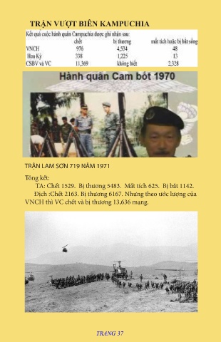 TRẬN VƯỢT BIÊN KAMPUCHIA TRẬN LAM SƠN 719 NĂM 1971 Tông kết: TA: Chết 1529. Bị thương 5483. Mất tích 625. Bị bắt 1142. Địch :Chết 2163. Bị thương 6167. Nhưng theo ước lượng của VNCH thì VC chết và bị thương 13,636 mạng. TRANG 37