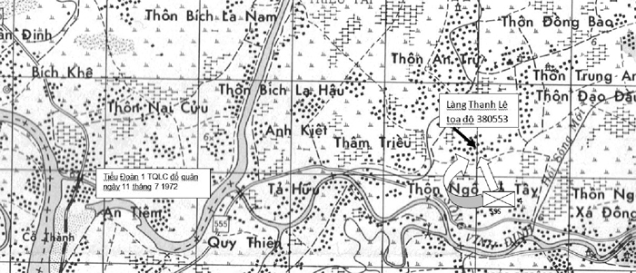 Tình hình rất căng thẳng vì nhiều tiếng súng lớn nhỏ bắn chéo trên trục tiến quân xuất phát từ hướng Tây- Bắc. Khoảng quá trưa tại TBĐ (trung bình điểm) 382547 thuộc thôn Ngô Xá Tây, ĐĐ 4, cánh quân mở đường của Cánh B đang tạm dừng để ăn trưa. Quan sát hướng Tây- Bắc, mà trưa nay anh em chúng tôi ghi nhận có nhiều tiếng súng bắn ngang trục tiến quân, bằng ống nhòm, tôi thấy sau lũy tre xanh có hình dáng trông giống pháo tháp chiến xa, cùng những nòng súng cao xạ với đám lá ngụy trang đã ngã màu. Đây là thôn Thanh Lê TBĐ 380553, trong bản đồ không có tên Thanh Lê(TL), dân chúng địa phương cho biết địa danh này.
