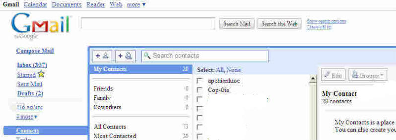 1. Trong trang đầu của Gmail, bạn hãy Click vào chữ [ Contacts ]