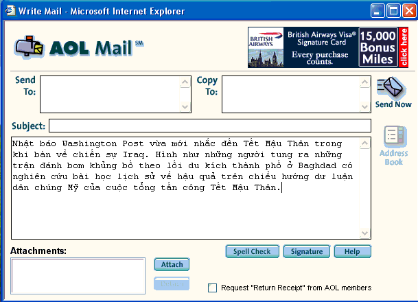 8. Để gõ email, quý vị click vào Write Mail icon, sẽ có màn ảnh AOL mail xuất hiện như quý vị thường dùng. Sau đó, quý vị bắt đầu gõ chữ Việt một cách thoải mái mà không bị trở ngại như trước đó.