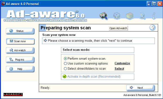 1. Double-click vào icon có tên là Ad-aware 6.0 ở phần Desktop hoặc click vào Start > All Programs > Lavasoft Software 6 > Ad-aware 6. Quý vị sẽ thấy một màn ảnh xuất hiện như sau: