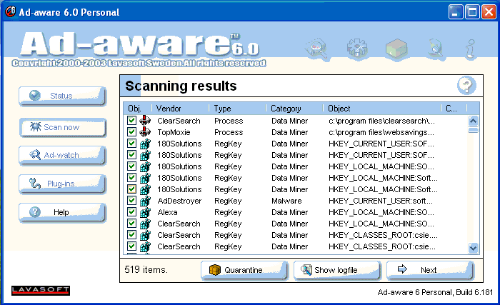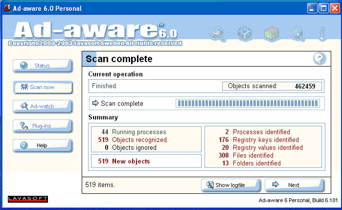 Nhu liệu bắt đầu scanning. Sau khi phần scan được kết thúc, nó sẽ báo cho quý vị biết có bao nhiêu thằng em adwares nằm vùng trong máy.