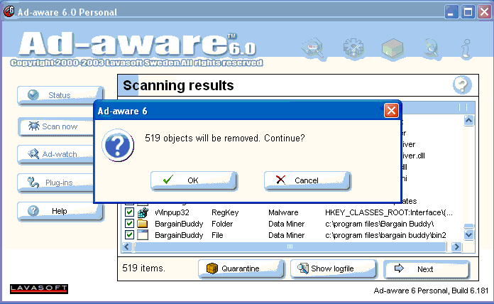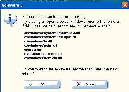 5. Click vào nút OK để remove chúng. Nếu có vài objects mà nhu liệu Ad-aware không thể remove, nhu liệu Ad-aware sẽ popup một window như sau:
