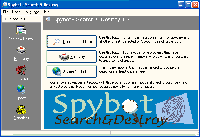 1. Double-click vào icon có tên Spybot - Search & Destroy ở nơi Desktop hoặc Start > All Programs > Spybot - Search & Destroy > Spybot - Search & Destroy. Quý vị sẽ thấy một màn ảnh như sau xuất hiện: