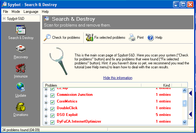 2. Click vào nút Check for problems để bắt đầu tìm những tên nằm vùng. Nhu liệu bắt đầu scanning máy của quý vị. Sau khi scan được chấm dứt, nó sẽ thông báo cho quý vị biết những tên nằm vùng nguy hiểm này. Quý vị có thể click vào nút Print để in và tìm hiểu những tên nằm vùng này.