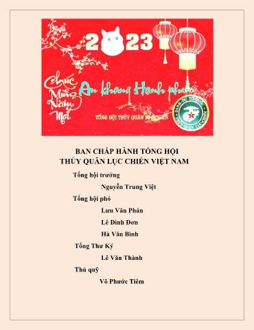 BAN CHẤP HÀNH TỔNG HỘI THỦY QUÂN LỤC CHIẾN VIỆT NAM Tổng hội trưởng Nguyễn Trung Việt Tổng hội phó Lưu Văn Phán Lê Đình Đơn Hà Văn Bình Tổng Thư Ký Lê Văn Thành Thủ quỹ Võ Phước Tiêm