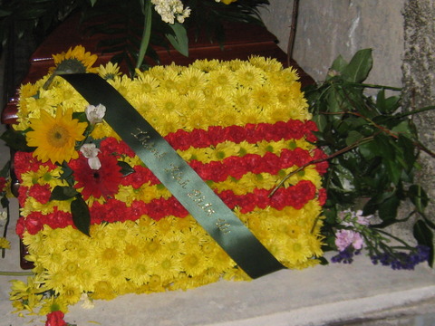 cờ vàng ba sọc đỏ, có hai ribbons: "Thành kính Phân Ưu" và "Tổng Hội